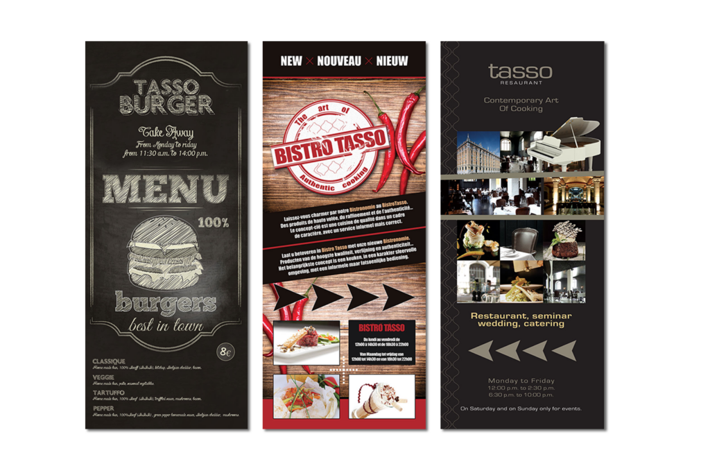 Une sélection de supports imprimés. Menus, publications, identités visuelles. Toujours au service du message.